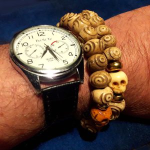 Bracelet pour homme en os gravé avec deux têtes de mort faites main avec la symbolique de l’œil de Bouddha..