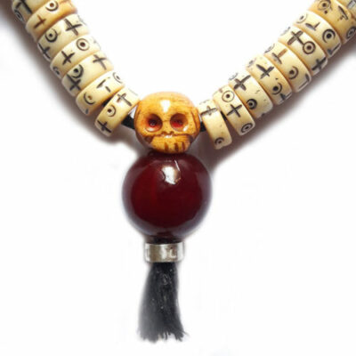 Mala Bouddhiste de prière bouddhiste tout fait main en os gravé avec des têtes de mort.