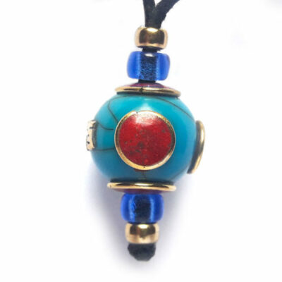 pendentif nepal, mantra bleu-rouge, perle en résine avec le mantra  »om mani padme hum » gravé sur laiton