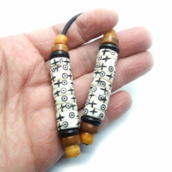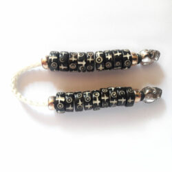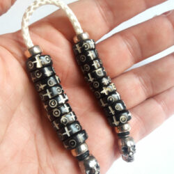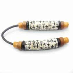 Le Komboloi est un objet similaire à un petit chapelet mais sans connotation religieuse. Il s’agit d’un passe-temps utilisé pour se détendre ou occuper les mains. Fabriqué à partir de perles en bois, en verre, en os, ou en matériaux précieux comme l’ambre, l’argent ou l’or. Il se distingue par la mobilité de ses perles par rapport aux chapelets religieux où celles-ci sont fixes. Les perles du Komboloi glissent librement le long du fil, permettant à l’utilisateur de les déplacer lentement entre ses doigts ou de les faire tourner plus rapidement. Ce mouvement produit un cliquetis régulier, favorisant la détente. Principalement utilisé en Grèce ou à Chypre, le Komboloi est traditionnellement porté sous forme de collier avec des perles. Une version alternative, proposée par TOTMANI, est constituée d’os gravé en forme de fer à cheval relié par une lanière en cuir, chanvre, coton ou nylon.