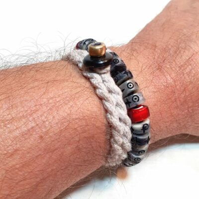 arte povera, collier braceleten tresse en coton avec perle en corne