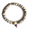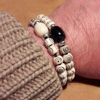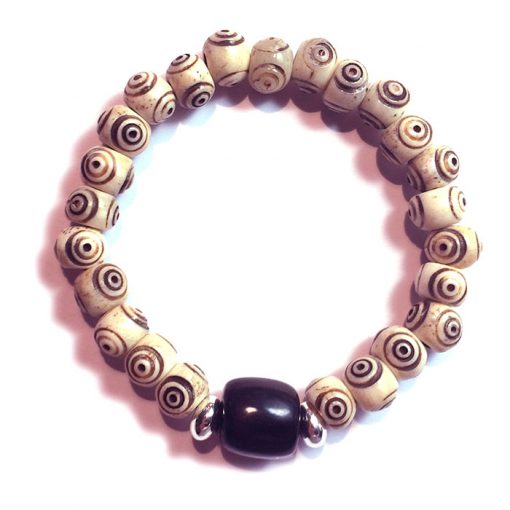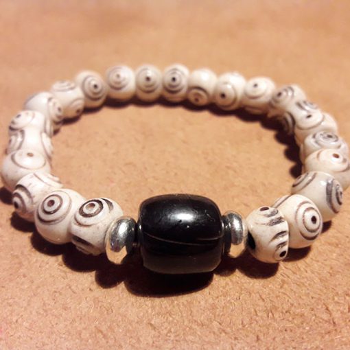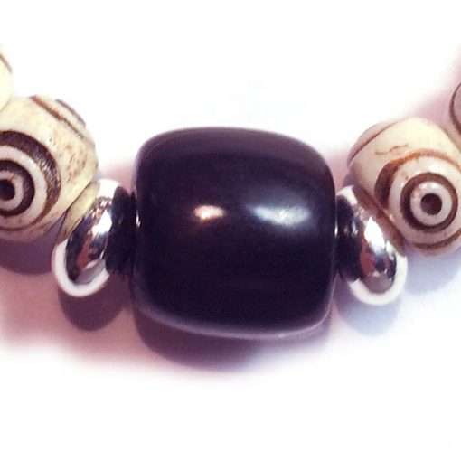 Bracelet pour homme fait main en os gravé avec la symbolique de l’œil de bouddha et une olive en corne ou résine blanche/noire. Deux perles en argent donne l’éclat qui caractérise ce bracelet