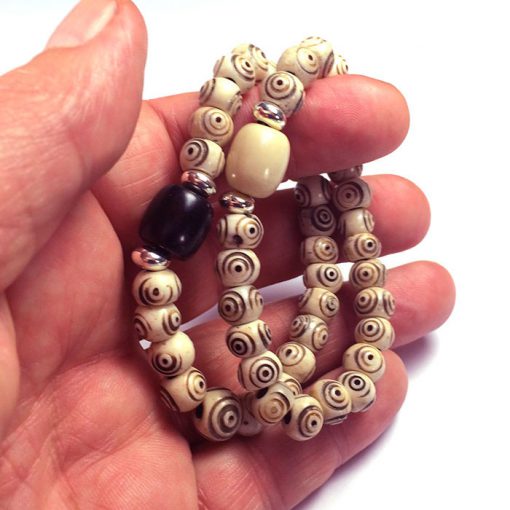 Bracelet en os et corne fait main avec 2 perles en argent. Les cercles gravés sur le bracelet symbolisent l’œil de Bouddha qui voit tout, qui vous guide et protège. Très beau bracelet, élégant, féminin,