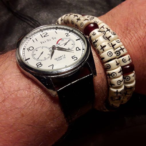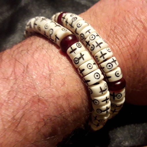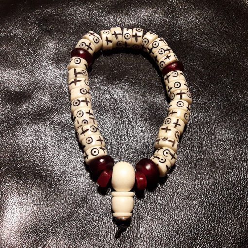 Ce bracelet est composé de 28 à 31 perles en os heishi avec 6 perles en corne intercalées. La terminaison est faite avec une perle »guru ». Un Mala (chapelet de prière Népalais, Tibétain, Hindou) est composé de 108 perles la dernière s’appelle la perle guru, elle est plus grande que les autres et représente la sagesse, la réalisation du vide absolu, et la perle cylindrique sur le dessus de la grosse perle symbolise le vide lui-même, ce que l’on appelle la vacuité.