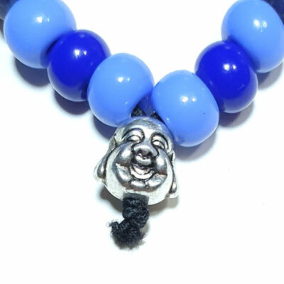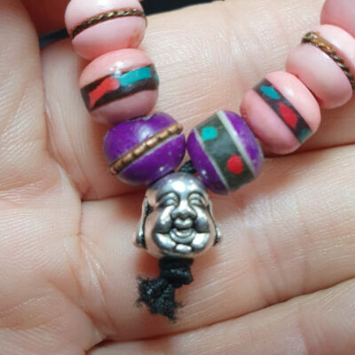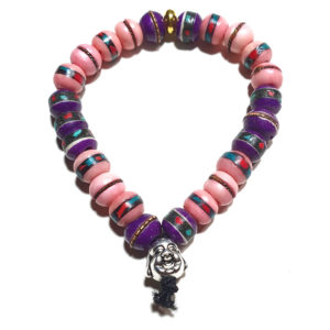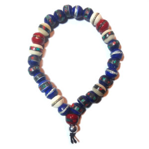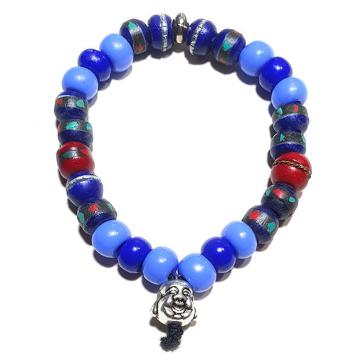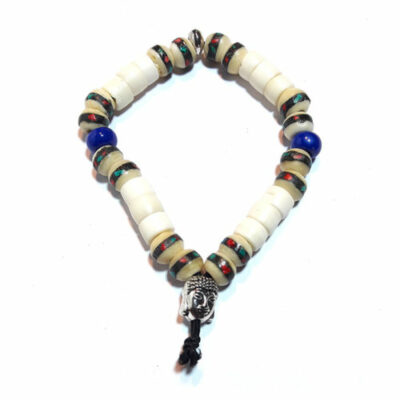 Bracelets Nepali, fait main, en perles d’os incrustés d’éclats de verres colorés, du verre colorés et une figurine en métal argenté représentant bouddha. Le bracelet Nepali est disponible en bleu, orange, violet, vert et blanc.