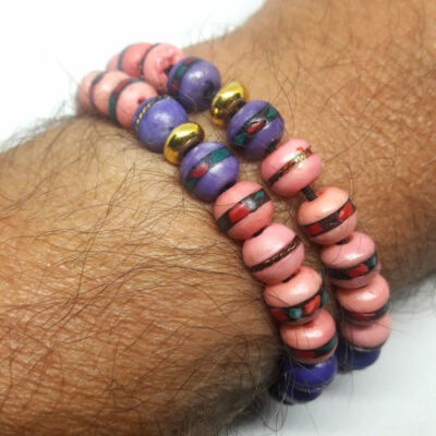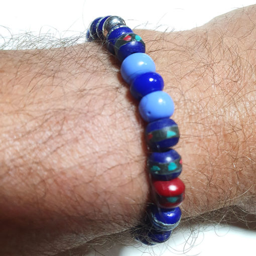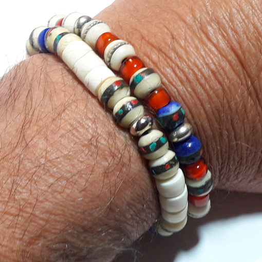 Bracelet Nepali , fait main, en perles d’os incrustés d’éclats de pâte de corail ou Lapis Lazuli ou turquoise. Cette technique d’incrustations est très spécifique a l’artisanat Népalais tout comme celui du Tibet.