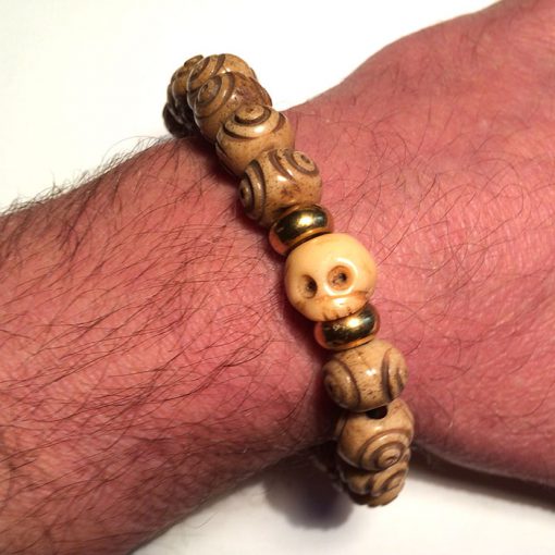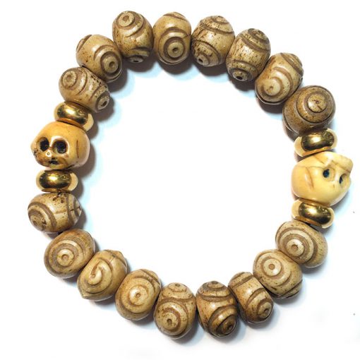 Bracelet pour homme en os gravé avec deux têtes de mort faites main avec la symbolique de l’œil de Bouddha..