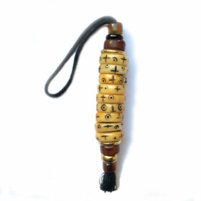 Mani tsewa, fait en os gravé et corne de yak, laiton. Le mani est un petit chapelet de prière bouddhiste (Népal, Tibet). La puissance spirituelle, protectrice et porte bonheur d’un mani, doit s’acquérir avec de la méditation : il faut dialoguer avec l’objet, le charger d’énergie positive. Un mani, comme tout objet bouddhiste, n’est pas seulement symbole de prière, mais aussi une œuvre d’art à grande valeur spirituelle. Porte-bonheur tel un talisman, ou une amulette, il peut être aussi un objet à garder sur soi, accroché à son sac ou au jeans, utilisé comme porte clef ou simplement a manipuler pour se relaxer. … c’est un objet hétéroclite, à chacun d’en trouver l’utilité.