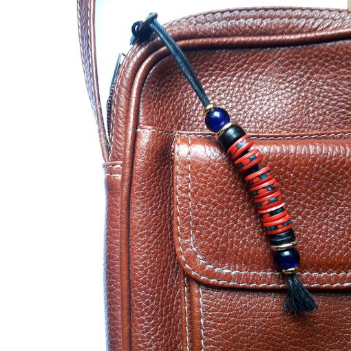 LE TALISMAN »cœur de désir », fait main dans les ateliers Totmani en os avec des incrustations de pâte de corail et turquoise, coton, verre cobalt et anneaux en laiton. C’est un porte bonheur que l’on attache à son sac, jeans, téléphone ou à toute autre objet que l’on porte avec soi quotidiennement. Ces perles sont d’origine Népalaises utilisés par les moines pour confectionner les malas (chapelets de prière). A noter la symbolique des matériaux utilisés. Le bag charm peut aussi se convertir en talisman.