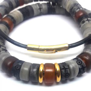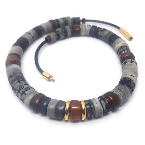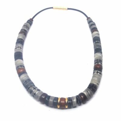 Collier de perles en os de yak, la coloration des perles est en nuances gris clair allant vers le noir. Le centre du collier se présente avec une perle en corne, également de yak avec deux perles dorées (10 micron) . La fixation se fait avec fermeture à baïonnette magnétique.