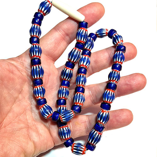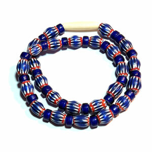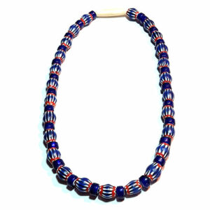 Le collier chevron en verre bleu avec des motifs en chevrons africains est d’une beauté remarquable, et il est fabriqué de manière similaire aux techniques utilisées à Murano (Venise, Italie). En Afrique, les chevrons en verre étaient autrefois utilisés comme moyen d’échange.
