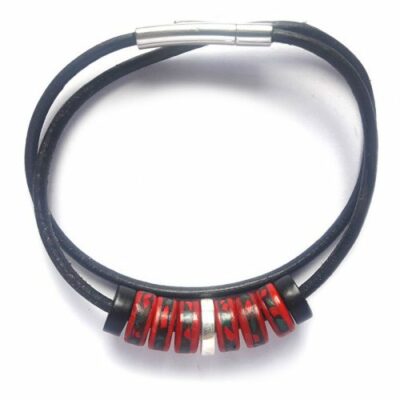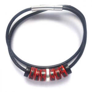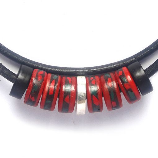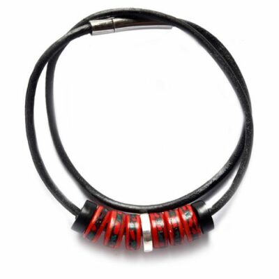 Collier cœur de lune, création de l’atelier TOTMANI , fait en os de yak du Népal, avec de la pâte de corail et turquoise incrusté. Le collier tient avec une lanière en cuir noir avec une fixation solide en baïonnette magnétique.