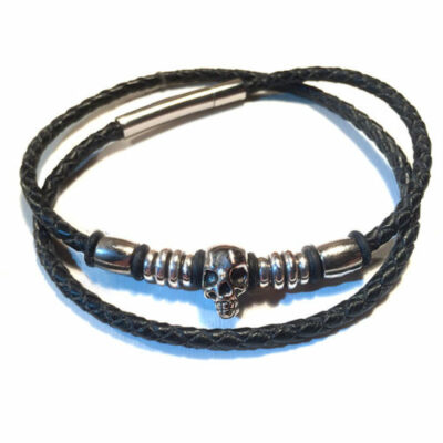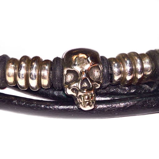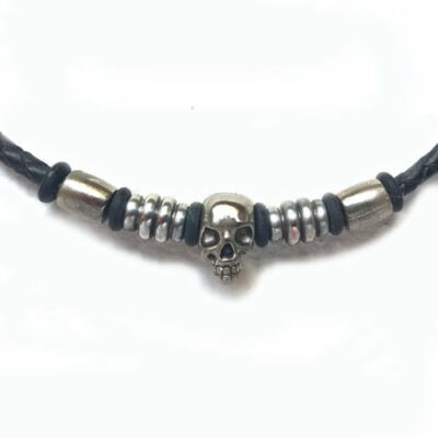 Lanière en cuir tressé, tête de mort en métal, fixations en inox.