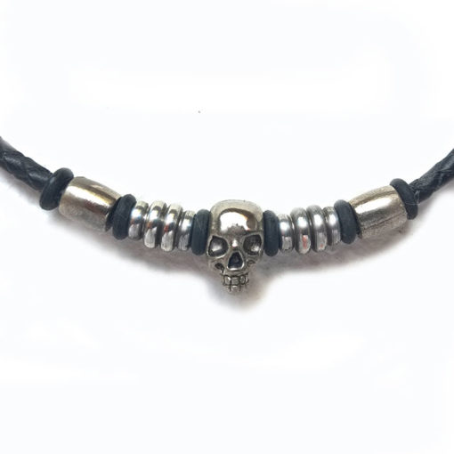 Collier pour homme, lanière en cuir tressé, tête de mort et rondelles en métal fixations par cro chet magnétique en inox.