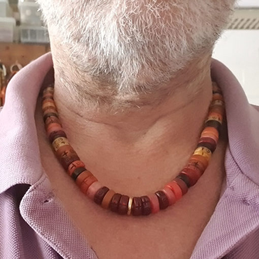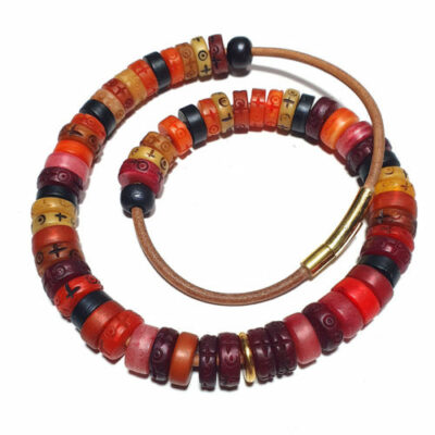 Collier multicolor terre, création de l’atelier TOTMANI , fait en os de yak gravé et teint main avec des colorants naturels tels que l’hibiscus, baies rouges, pelure d’ognons, curcuma.