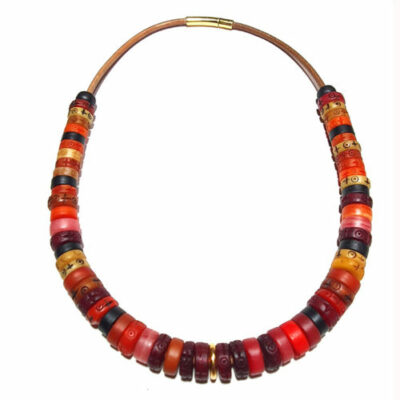 Collier multicolor terre, création de l’atelier TOTMANI , fait en os de yak gravé et teint main avec des colorants naturels tels que l’hibiscus, baies rouges, pelure d’ognons, curcuma. Collier fait avec une lanière en cuir , un anneau en plaqué or au centre et une fixation avec un clip doré. . Le collier reflète une trés belle harmonie de couleur qui rappelle la nature en automne. création faite uniquement en 5 exemplaires.