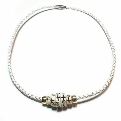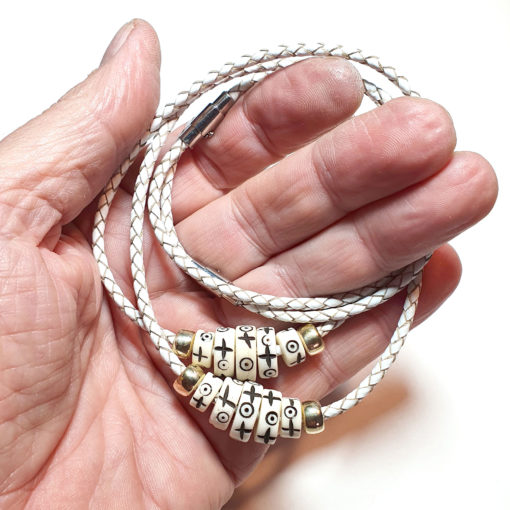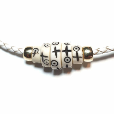 Collier Nepali blanc, création atelier Totmani en os de yak gravé. La lanière est en cuir tressé et la fixation en baïonnette aimanté. Les rondelles en os comportent des gravures figurant le cercle qui symbolise la protection et la croix qui symbolise le voyage. Trés beau.