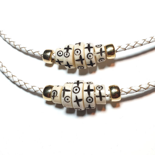 Collier Nepali blanc, création atelier Totmani en os de yak gravé. La lanière est en cuir tressé et la fixation en baïonnette aimanté. Les rondelles en os comportent des gravures figurant le cercle qui symbolise la protection et la croix qui symbolise le voyage. Trés beau, élégant, discret.
