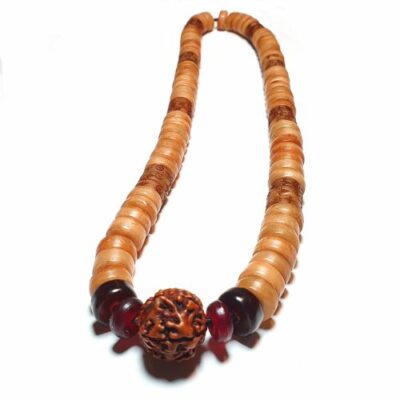 La perle centrale est une graine d’Elaeocarpus angustifolius, (souvent appelé Cerisier bleu) un arbre sacré de l’inde qui produit le graines rudraksha.