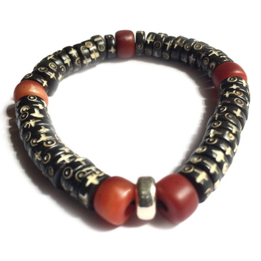 Bracelet homme fait main en os noir gravé, corne et anneau en argent 925 avec la symbolique Bouddhique (+O)