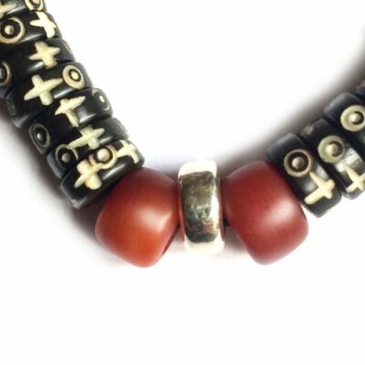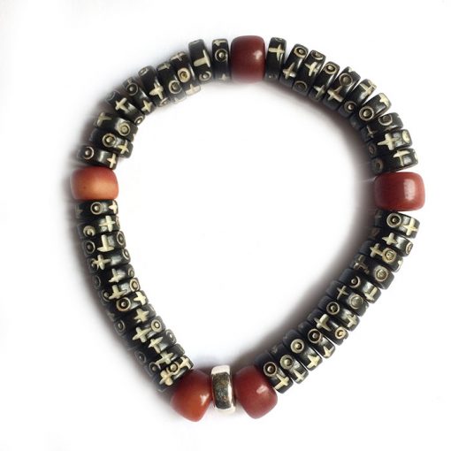 Lama bracelets homme fait main en os de yak noir gravé (Ø 9mm), corne et anneau en argent 925 avec la symbolique de la croix et du cercle.