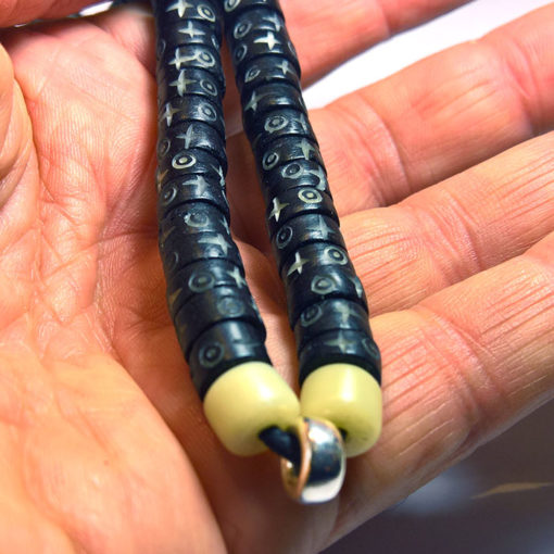 Collier homme fait main en os noir gravé, corne et anneau en argent 925 avec la symbolique du cercle et de la croix.