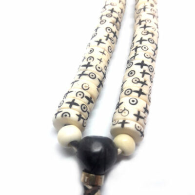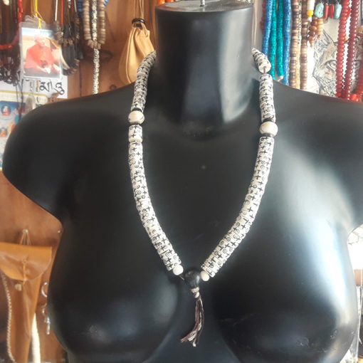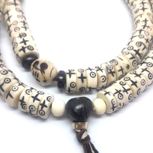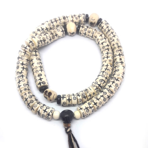Mala KANG, création de TOTMANI pour un Lama du Népal. Il est fait main en respectant la tradition tibétaine. Il comporte 108 perles en os de Yak, l’ensemble est tenu avec 3 fils de coton qui symbolisent les 3 vies de Bouddha même symbolique pour les 3 têtes de mort qui assemblent les 4 groupes de 27 perles (4×27=108). 108 est un chiffre que l’on retrouve et qui représente une symbolique philosophique  dans beaucoup de cultures.