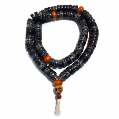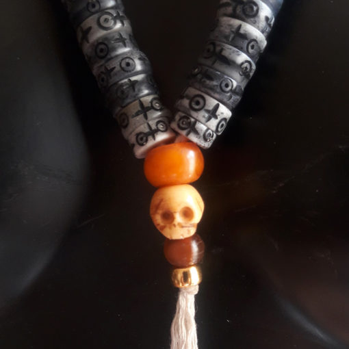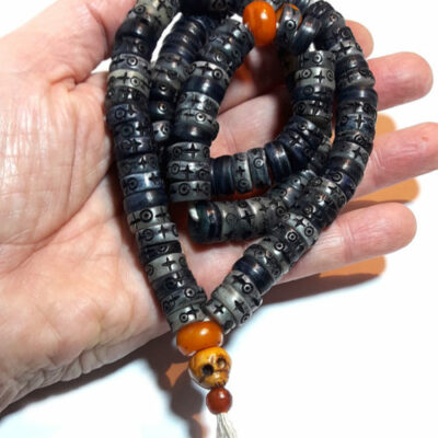 Le Mala ZIGSA est fait main en os gravé et résine-ambre. C’est un chapelet de prière bouddhiste du Tibet et Népal qui sert à la récitation ds mantras.. Zigsa est un prénom Tibétain qui signifie « léopard des neiges » d’où sa couleur blanche et gris-cendre. Il à 108 perles, avec une perle séparateur en ambre-résine entre chaque série de 27. L’os a été traité avec de l’huile animale ce qui lui donne cet aspect brillant.