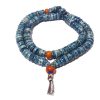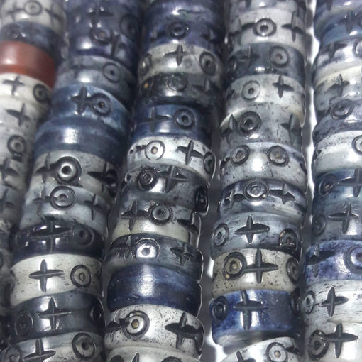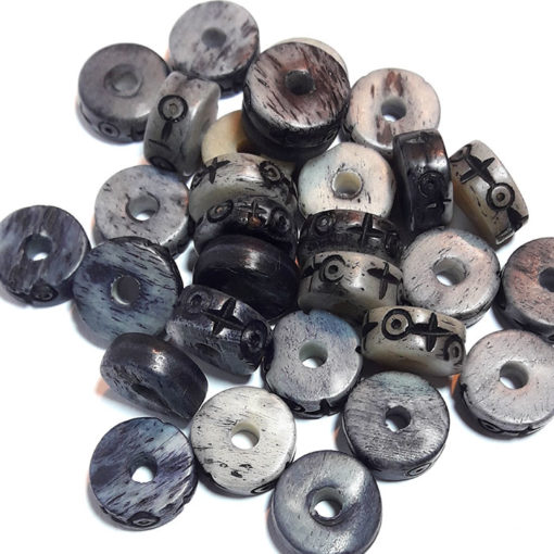 Les perles heishi en os comportent des gravures qui représentent l’oeil protecteur de Bouddha, le soleil, l’or (l’or en tant que symbolique de quelque chose de précieux et d’éternel), et la croix symbole des 4 directions