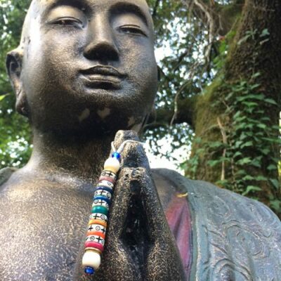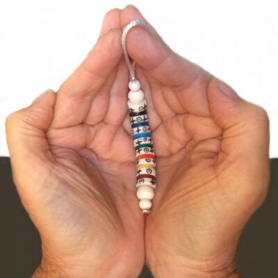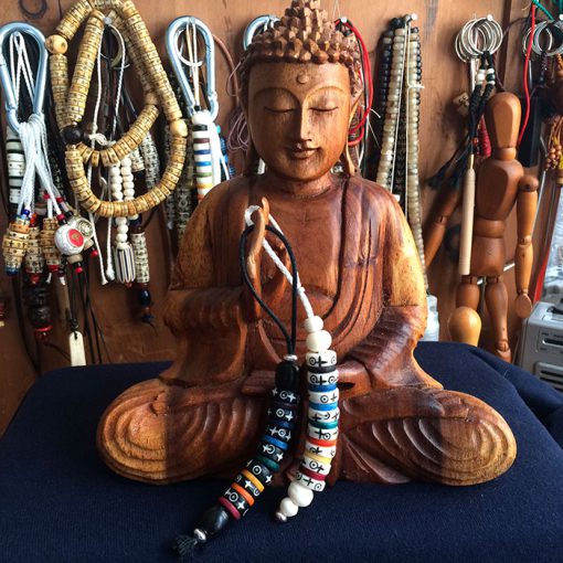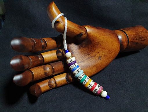 Le Mani un chapelet de prière tibétain, avec des rondelles d’os incrustés représentant les 7 chakras. La méditation se fait en tenant en main la couleur du chakra que l’on veut ouvrir.