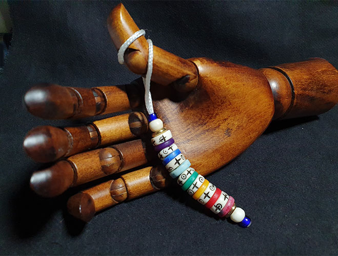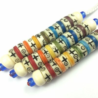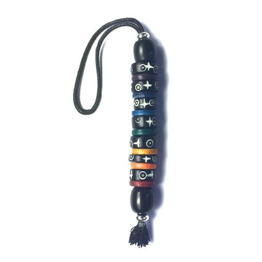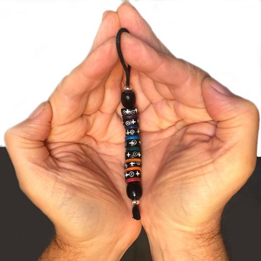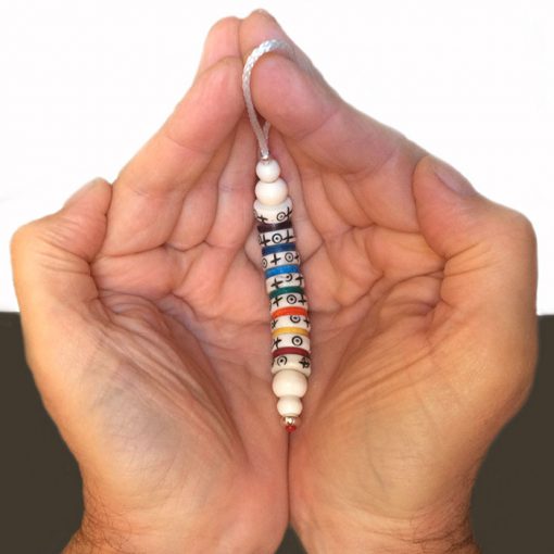 Ce mani est un chapelet de prière tibétain, avec des rondelles d’os incrustés représentant les 7 chakras. La méditation se fait en tenant en main la couleur du chakra que l’on veut ouvrir.