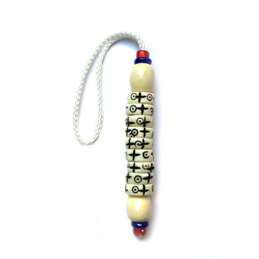 Chapelet de prière en os gravé fait main. C’est un petit clin d’œil à la France bleu/blanc/rouge. Peut être aussi porté en tant que porte clef ou bag-charm.
