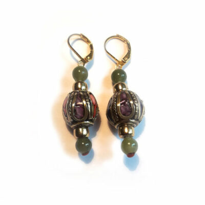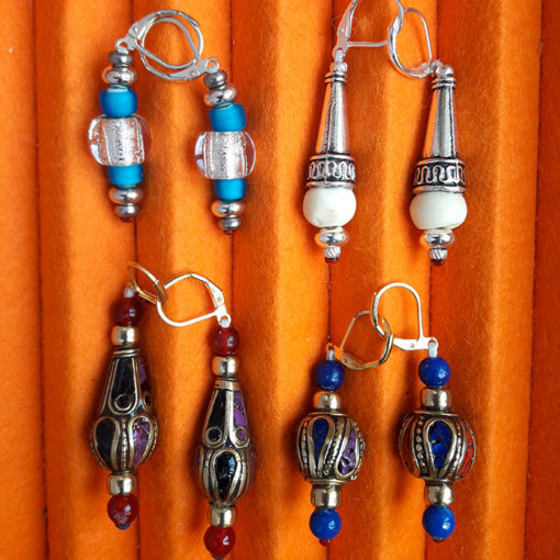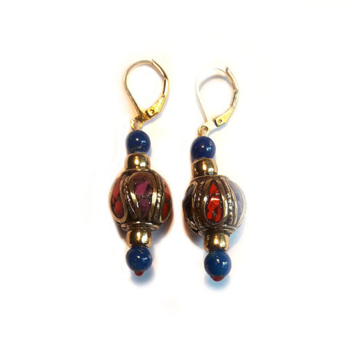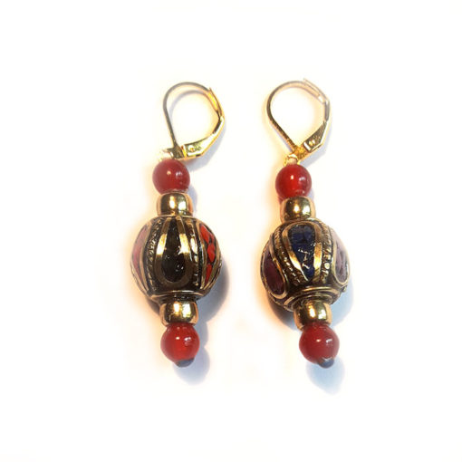 NEPALI, BOUCLES D’OREILLES en forme de goutte avec perle en verre rouge corail. fixation en argent 925 (boucle). incrustation de laiton et de pâte de corail, turquoise et lapis lazouli. le laiton est traité anti-oxydation. Fixation en argent 925, non allergique. C’est un bijoux léger à porter, élégant, discret.