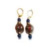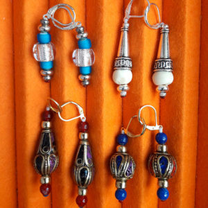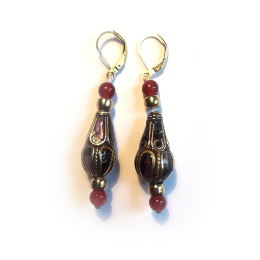 NEPALI, BOUCLES D’OREILLES en forme de goutte avec perle en verre rouge corail. fixation en métal argenté 925 (boucle). incrustation de laiton et de pâte de corail, turquoise et lapis lazouli. le laiton est traité anti-oxydation. Fixation en argent 925, non allergique. C’est un bijoux léger à porter, élégant, discret.