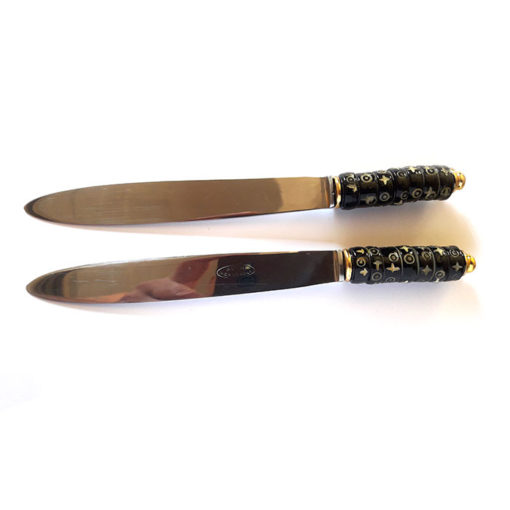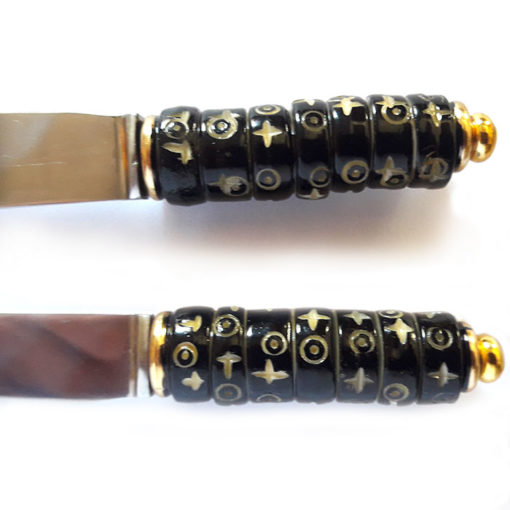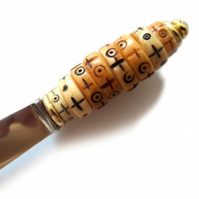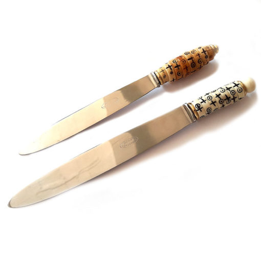 Ouvre courrier gold à manche court en os de yak gravé. Le corps est en acier inoxydable. Disponible en deux tailles; longueur lame 11 et 14cm. Disponible à l’achat chez TOTMANI en blanc, noir et gold