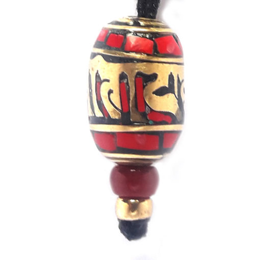 COLLIER Népalais rouge, perle en résine avec le mantra »om mani padme hum » gravé sur laiton, une pâte de corail recouvre la perle lui donnant avec le laiton un aspect brillant et solaire.