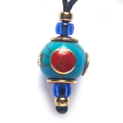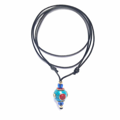 Le fleur de l’artisanat Népalais, pendentif fait main, perle népalaise en résine bleu travaillée avec de la pâte de corail rouge encerclé avec du laiton, corde en coton noir avec nœud coulissant (taille ras le cou,43cm). Très élégant à porter.