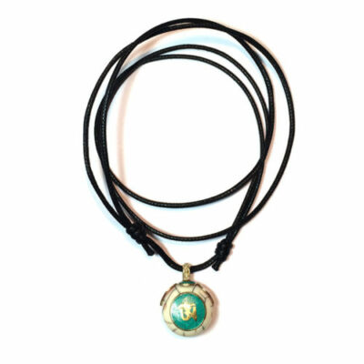Pendentif om, fait main, pendentif en résine avec incrustation, sur fond de pâte e turquoise, en laiton du symbole Ohm, fixation ajustable en lanière de coton noir
