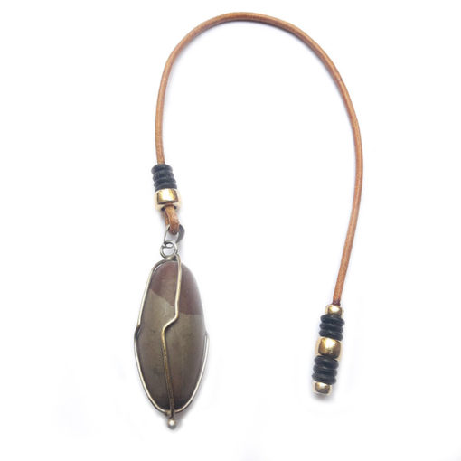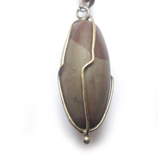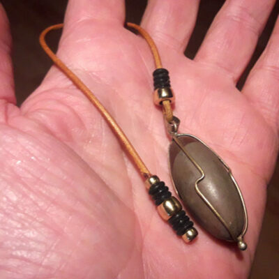 pendulum, le pendule de radiesthésie fait avec la pierre Shiva lingam, pierre sacrée de l’Inde que l’on retrouve uniquement dans la rivière Narmada, (fleuve qui coule d’est en ouest dans le centre de l’Inde.  Ce pendule est monté sur une lanière en cuir avec des anneaux en laiton. Le pendule lingam est l’outil en radiesthésie qui permet d’interroger son subconscient afin d’avoir des réponses à toute question.