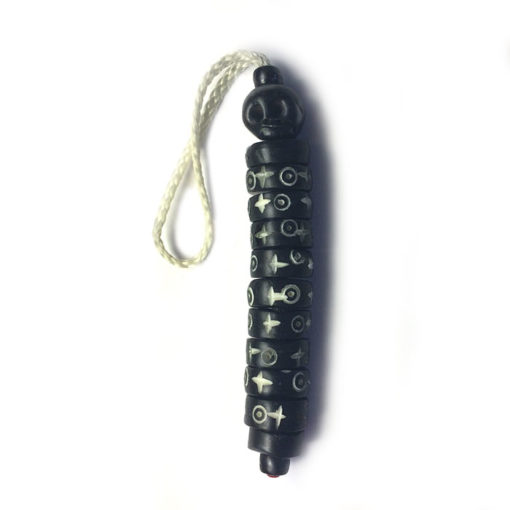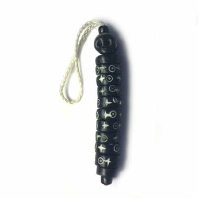 Il fait partie de la collection Dark Knight, noir sobre, élégant, avec une tête de mort au sommet. Il est chargé de la force du chevalier; imperturbable, fier, puissant, juste. Il apparaît et disparaît comme un ombre, insaisissables. Il faut lui faire hommage et être à l’auteur pour le porter, Fait entièrement a main, en os, corne et coton.