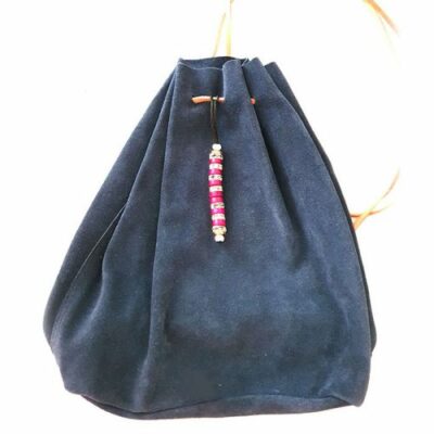 Sac a dos en daim, avec de fines bretelles, souple, agréable à porter. Disponible en marron, beige clair, bleu marine et version beige avec franges type David Crockett.