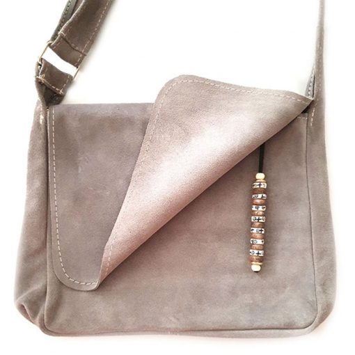 Sacoche daim à bandouilère fait main, proposé en plusieurs couleurs. bleu, gris souris, beige clair, cerise. Idéal pour ranger des petit objets; portefeuille, téléphone, clefs ….